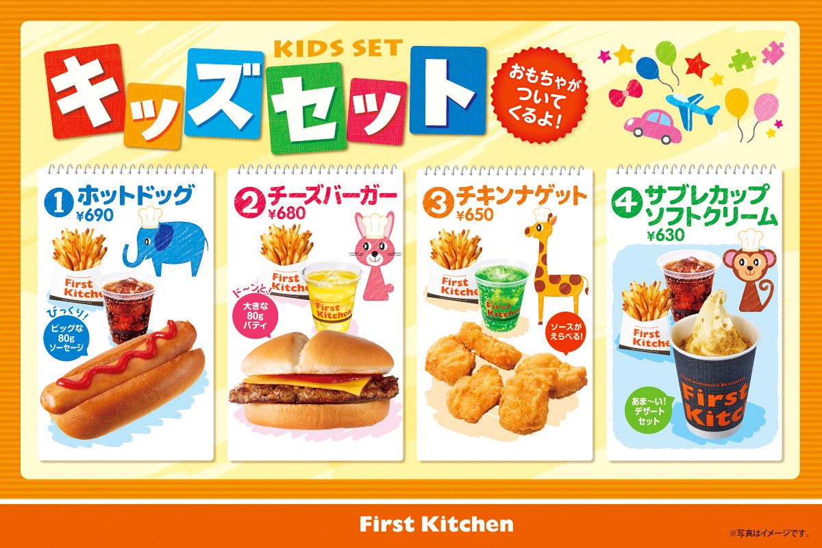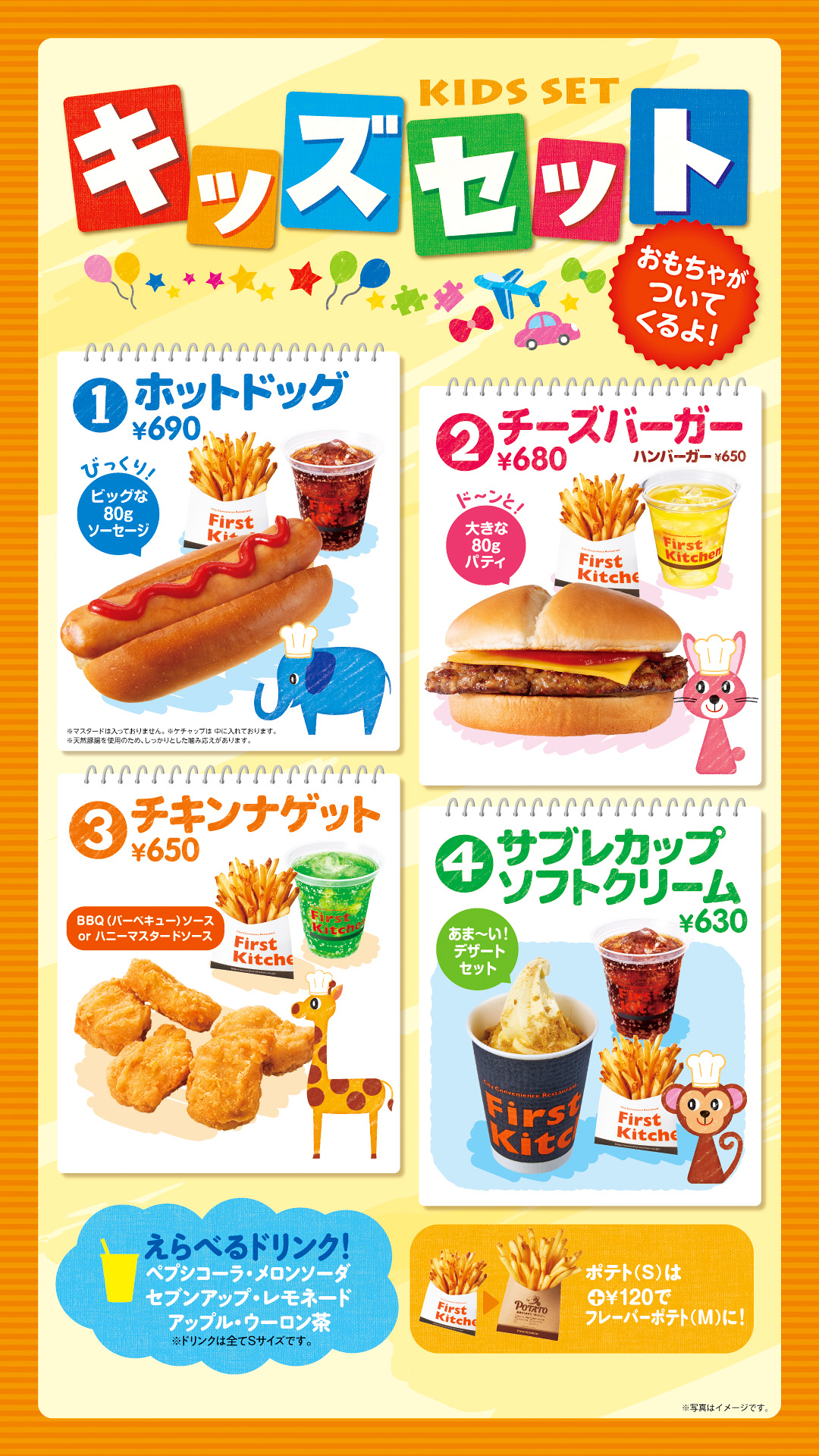 - 小さなお子さまにも「おいしい」と「うれしい」を。そして、ご家族みんながシアワセになれるひとときをお届けしたい。だからファーストキッチンでは、お子様のためのおいしさと楽しさにこだわったキッズセットをご用意しています。